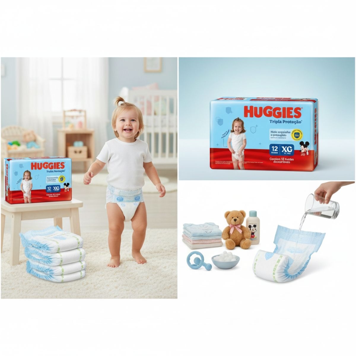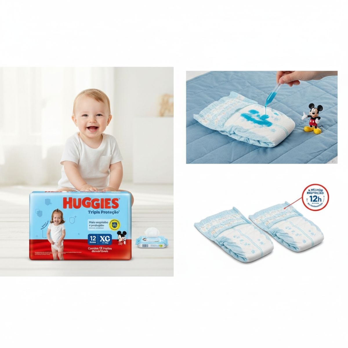 A fralda conta com camada interna macia que absorve rapidamente o líquido, distribuindo a umidade de maneira uniforme para evitar acúmulos. As barreiras laterais reforçadas auxiliam na contenção, enquanto o ajuste anatômico proporciona liberdade de movimento, permitindo que o bebê brinque, engatinhe e se movimente com conforto.