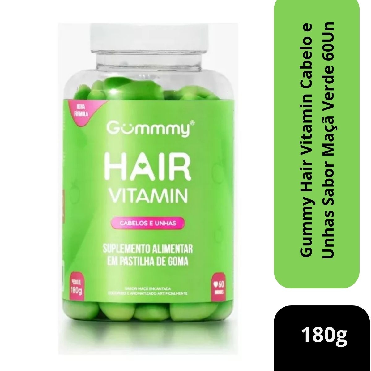 Cada frasco contém 60 unidades de gominhas com 180g, enriquecidas com Biotina, Vitamina A, C, E e Ácido Fólico, promovendo a manutenção da saúde dos fios e das unhas, de maneira saborosa e sem complicação.
