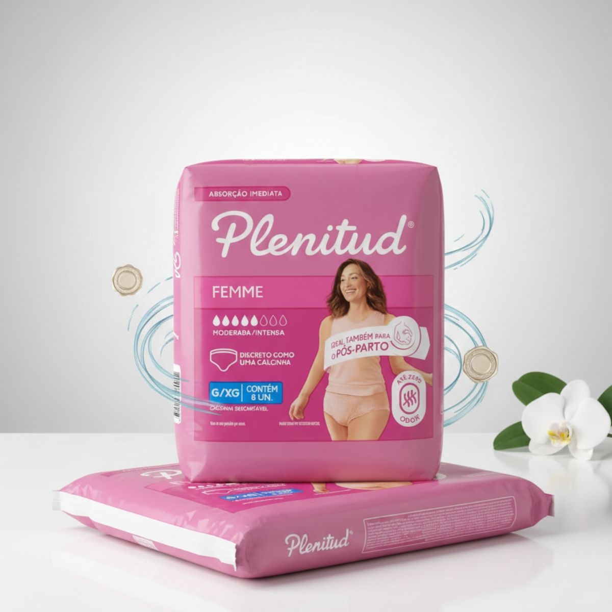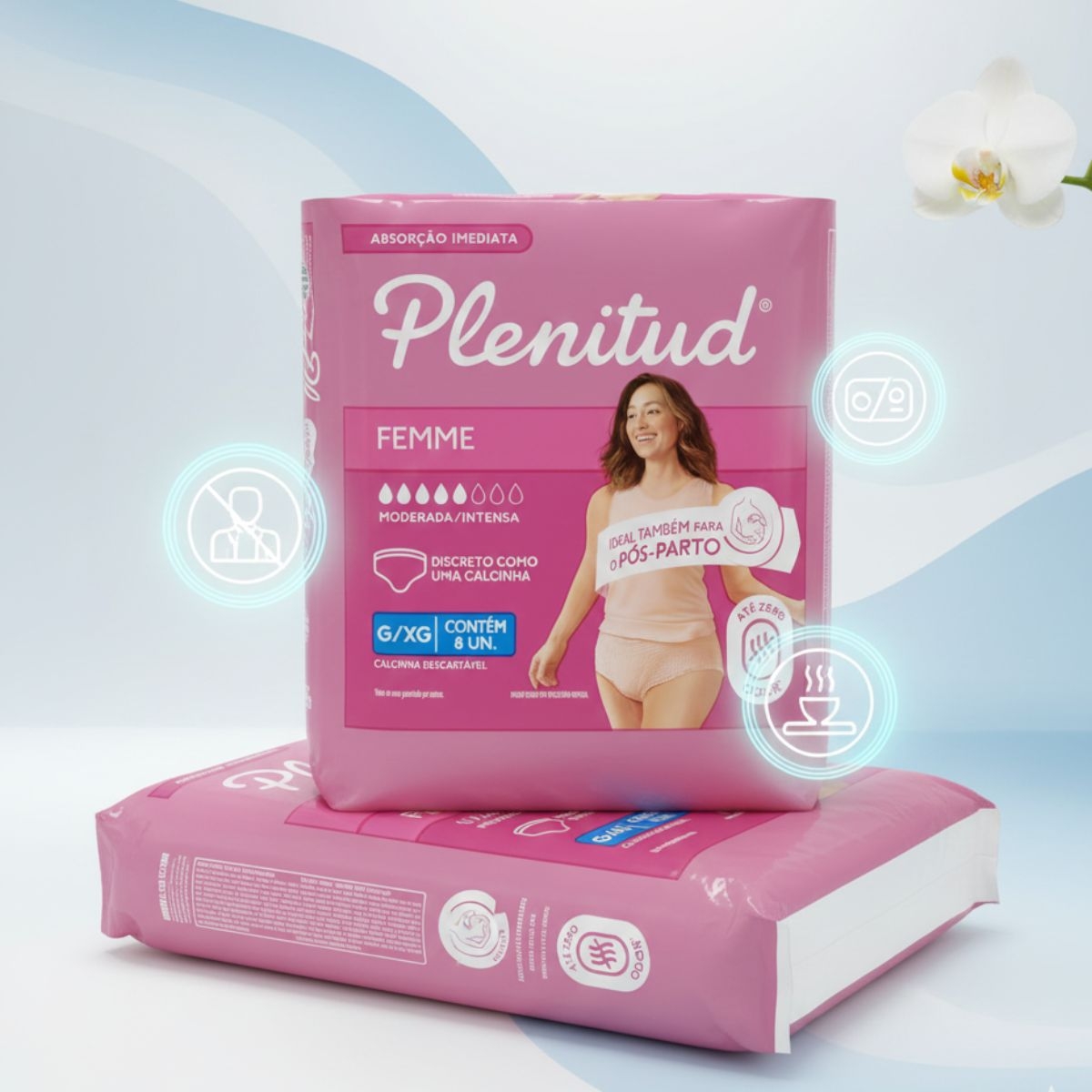 Indicada para uso diário a Plenitud Femme Active facilita a rotina ao permitir vestir e retirar com praticidade trazendo mais autonomia e confiança A embalagem com 8 unidades nos tamanhos G e XG é ideal para quem busca proteção eficiente aliada ao conforto e à discrição
